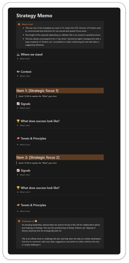 One tool that I found essential is what I like to call the “Strategy Memo” — a doc product leaders use to communicate quarterly or annual strategic focus that ends up shaping our OKRs