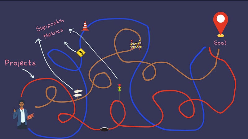 I see a lot of companies or leaders talking about KPIs as if they’re the destination. Also, metrics can sometimes be unique to the Project (aka the road) you decide to take leading to the goal. It’s highly related to the path (which is an assumption and can change), not the destination. Especially in early-stage startups, when most of the Projects are powered by a lot of intuition, those metrics become flexible